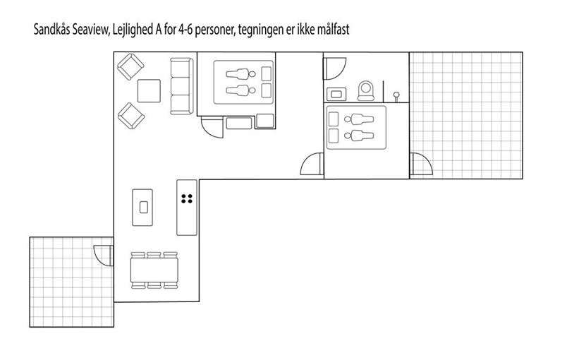 Fantastyczny apartament wakacyjny z pięknym wystrojem, dwiema tarasami i wspaniałym widokiem na morze. Przestronny apartament dla 4–6 osób obejmuje: przedpokój, łazienkę, 2 sypialnie z łóżkami podwójnymi (łącznie 4 miejsca do spania), kuchnię ze zmywarką oraz salon z rozkładaną sofą (2 dodatkowe miejsca do spania). Z salonu można wyjść na taras, z którego podobnie jak z salonu roztacza się widok na morze. Z drugiej strony apartamentu, przy wejściu, znajduje się kolejny taras, dzięki czemu można korzystać zarówno z porannego, jak i wieczornego słońca. Do dyspozycji są trzy apartamenty (A, B i C) o różnym układzie, lecz tej samej powierzchni – 75 m². Wszystkie apartamenty znajdują się na jednym poziomie, mają wejście z parteru i pozbawione są schodów. Obiekty są przeznaczone dla osób niepalących.