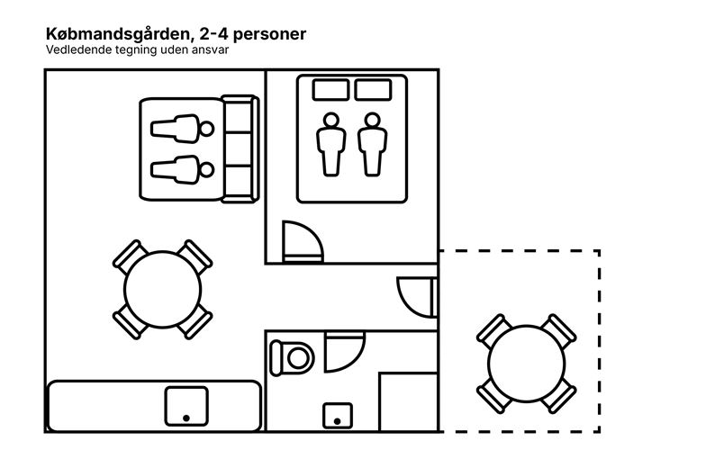 Købmandsgården oferuje komfortowe i przytulne apartamenty wakacyjne dla 2–4 osób, położone w samym sercu Gudhjem. Apartamenty są funkcjonalnie urządzone i obejmują oddzielną sypialnię, łazienkę oraz część dzienną z kuchnią, jadalnią i salonem z rozkładaną sofą. Wiele z nich posiada prywatne tarasy z meblami ogrodowymi i grillem, z których można podziwiać czerwone dachy miasteczka oraz częściowy widok na Morze Bałtyckie – idealne warunki na spokojny wypoczynek dla par i małych rodzin.