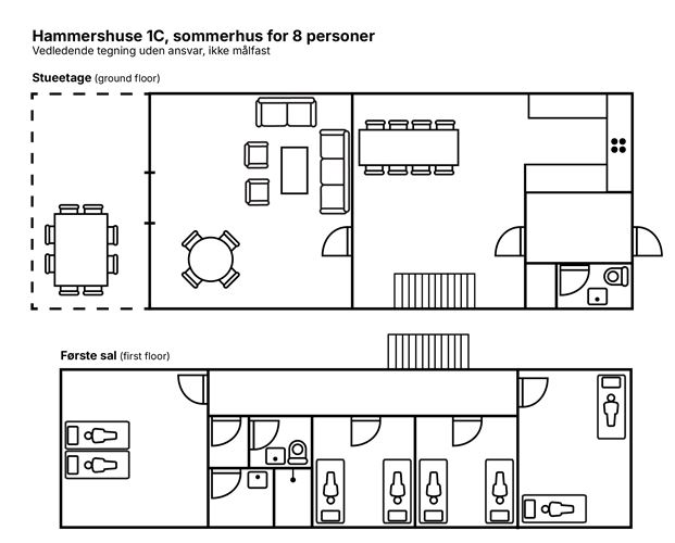 Hammershuse położone jest w wyjątkowym, malowniczym zakątku Bornholmu, skąd rozpościera się widok na morze oraz charakterystyczne klify północy wyspy. Na terenie obiektu znajduje się przytulna przestrzeń wspólna z placem zabaw, dmuchanym zamkiem, tyrolką, huśtawkami i boiskiem do petanque, dzięki czemu jest to idealne miejsce zarówno dla rodzin, jak i par. W zasięgu krótkiego spaceru znajdują się Hammerhavn, ruiny zamku Hammershus oraz bajkowe jezioro Opalsøen, a pobliskie Allinge-Sandvig oferuje liczne atrakcje kulturalne, gastronomiczne i rekreacyjne.