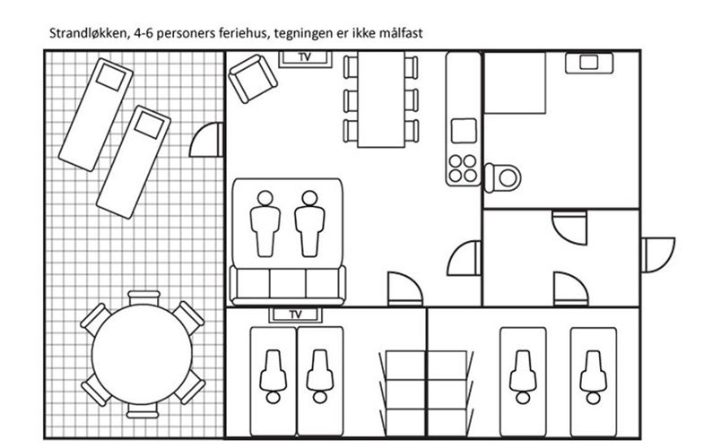 Feriehusene er beregnet til 4–6 personer og er funktionelt og komfortabelt indrettet. Indretningen omfatter entré med opbevaringsplads, badeværelse samt et soveværelse med to enkeltsenge. Husets centrale punkt er den rummelige stue i åben forbindelse med køkken og spiseplads, udstyret med en stor hjørnesofa med sovefunktion, en lænestol samt et spisebord til seks personer. Fra stuen er der adgang til det primære soveværelse. Hvert hus har to terrasser med havemøbler, hvilket giver mulighed for at nyde solen både om morgenen og om aftenen. Alle husene ligger på række og vender mod sydvest.